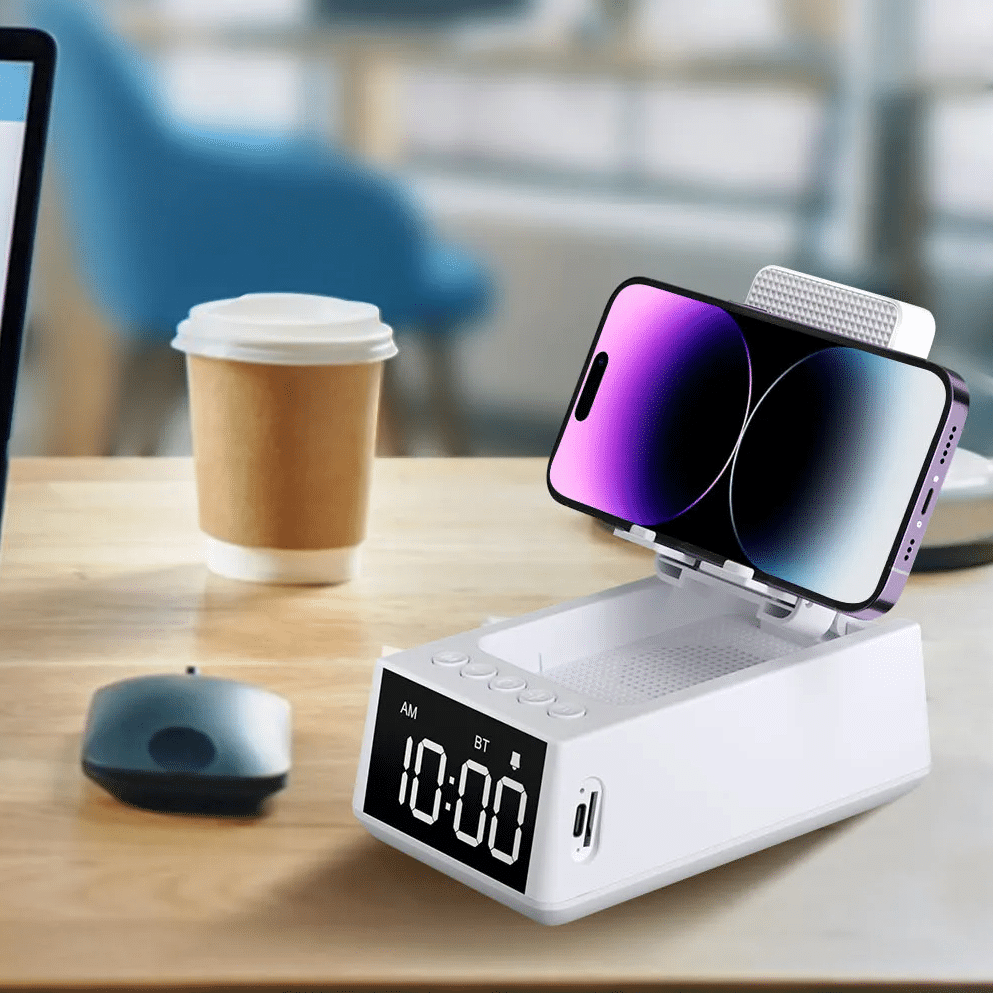 Cette horloge ne sert pas seulement à indiquer l’heure, elle fait également office de support de téléphone. Placez votre appareil sur le support dédié et utilisez-le comme réveil, pour des appels vidéo, ou simplement pour garder un œil sur vos notifications sans interrompre votre journée.