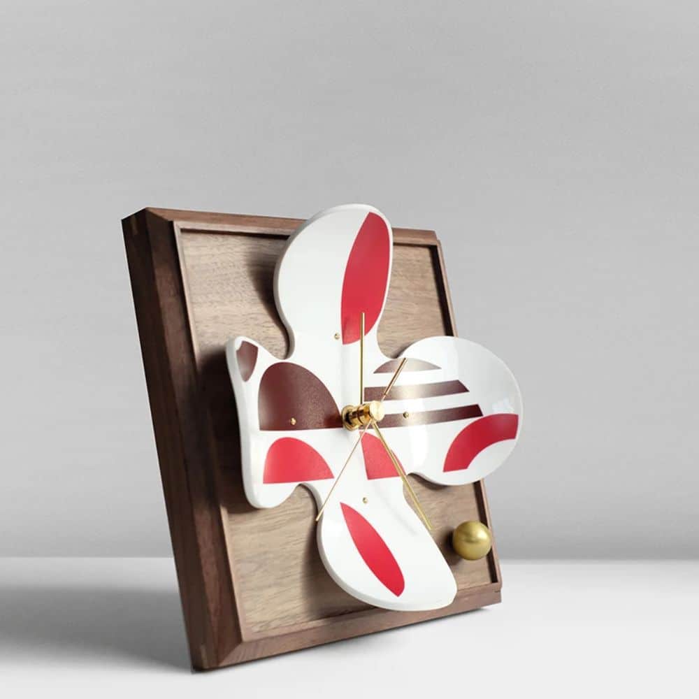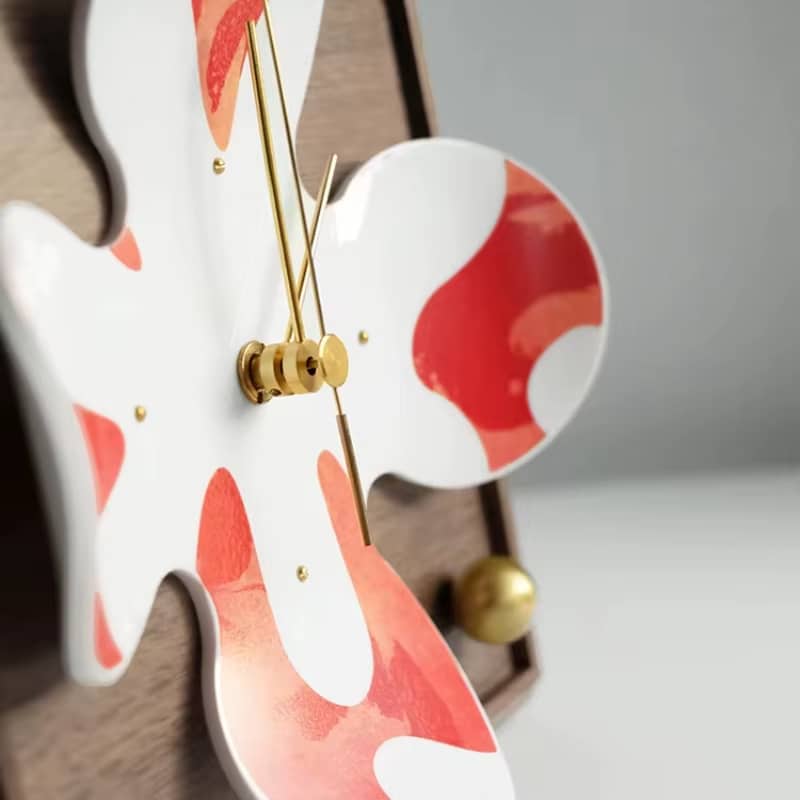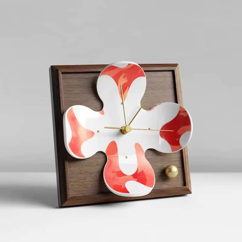 Cette horloge se distingue par son design à motifs inspirés des fleurs, revisité dans une version contemporaine. Les formes s’entrelacent pour créer un effet visuel léger et équilibré. Le cadran clair met en relief les aiguilles fines, offrant une lecture fluide de l’heure. L’association des couleurs rouges et marrons réchauffe l’ensemble et donne du caractère à la pièce. Son socle en bois carré assure une stabilité parfaite, tout en soulignant la qualité de l’objet.