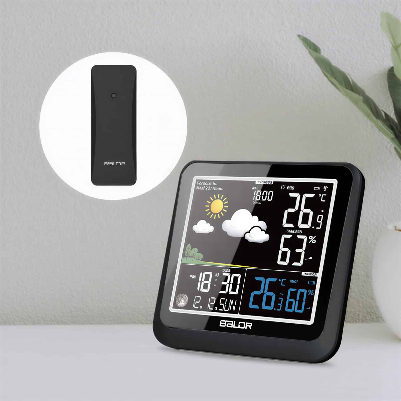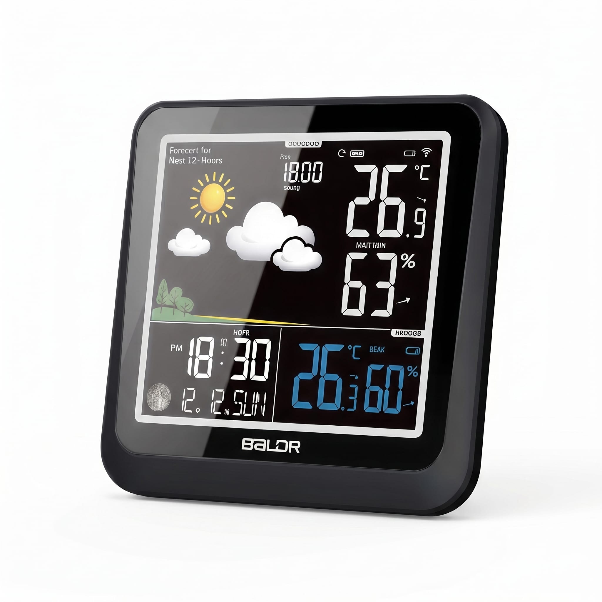 Dans l’Horloge Murale Digitale avec Station Météo, le boîtier noir mat encadre un écran brillant aux zones séparées, pratique pour lire la température intérieure et extérieure en °C/°F et l’humidité de 1 à 99 %. Les prévisions 12 à 24 h avec baromètre aident à anticiper, et la mémoire max/min suit les variations. Son rétro-éclairage blanc à variateur et le format 12/24H, avec une alarme snooze, conviennent à une chambre.