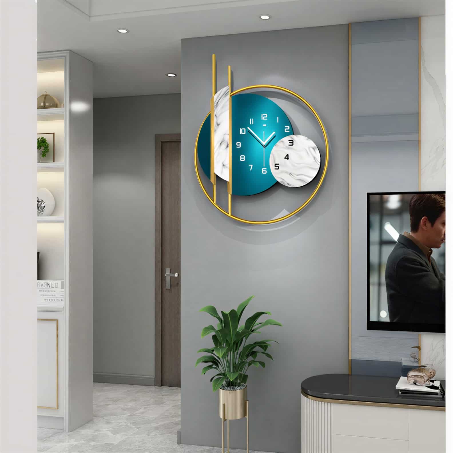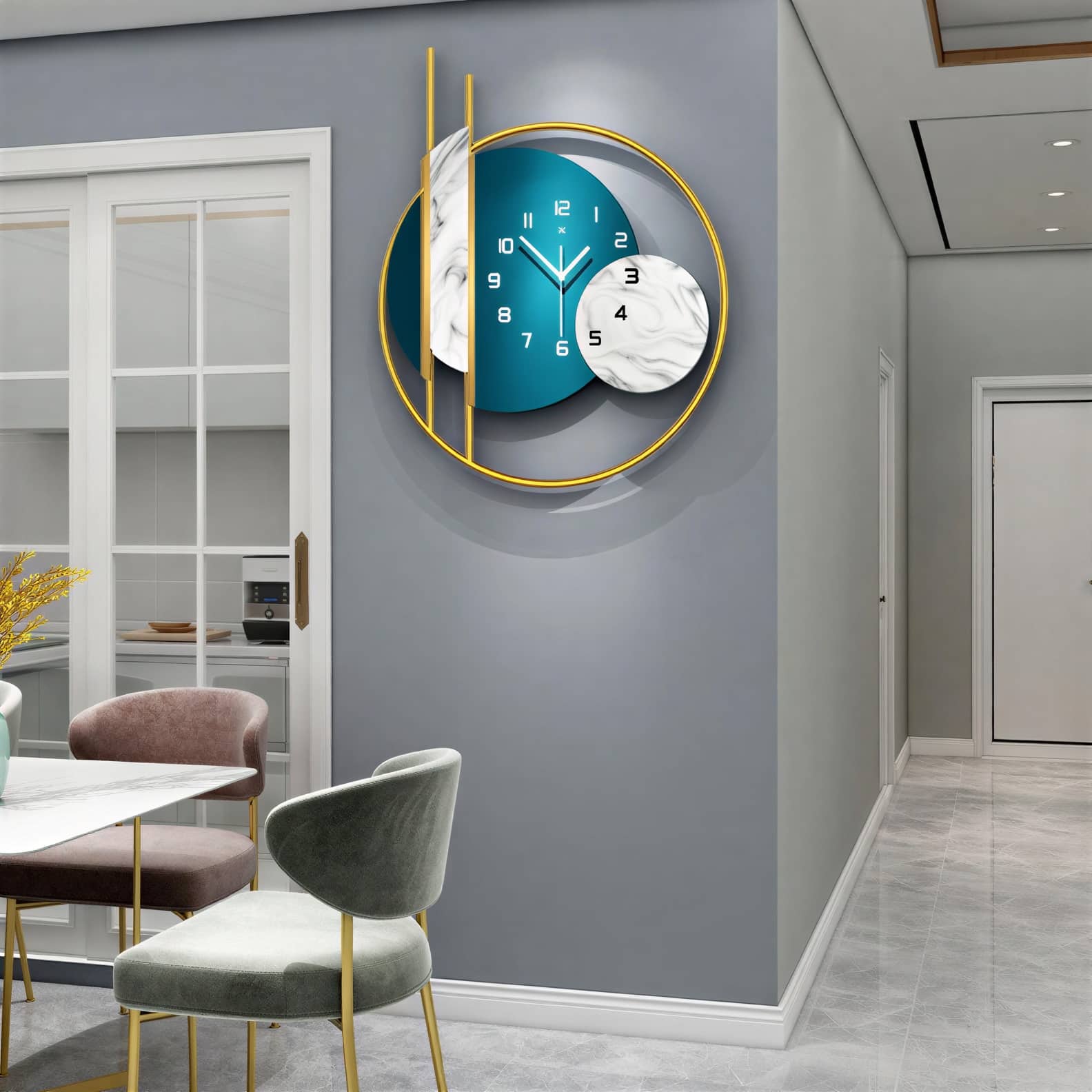 Cette Horloge murale design décoration moderne de luxe transforme un mur en scène élégante. Dans le salon, elle attire le regard dès l’entrée et donne une sensation d’ordre et de calme. Son style contemporain et ses touches dorées créent une ambiance chic, comme dans un hôtel. Vous profitez d’un repère clair, tout en ajoutant un vrai charme à votre déco. Idéale lors d’un dîner entre amis dans la salle à manger.