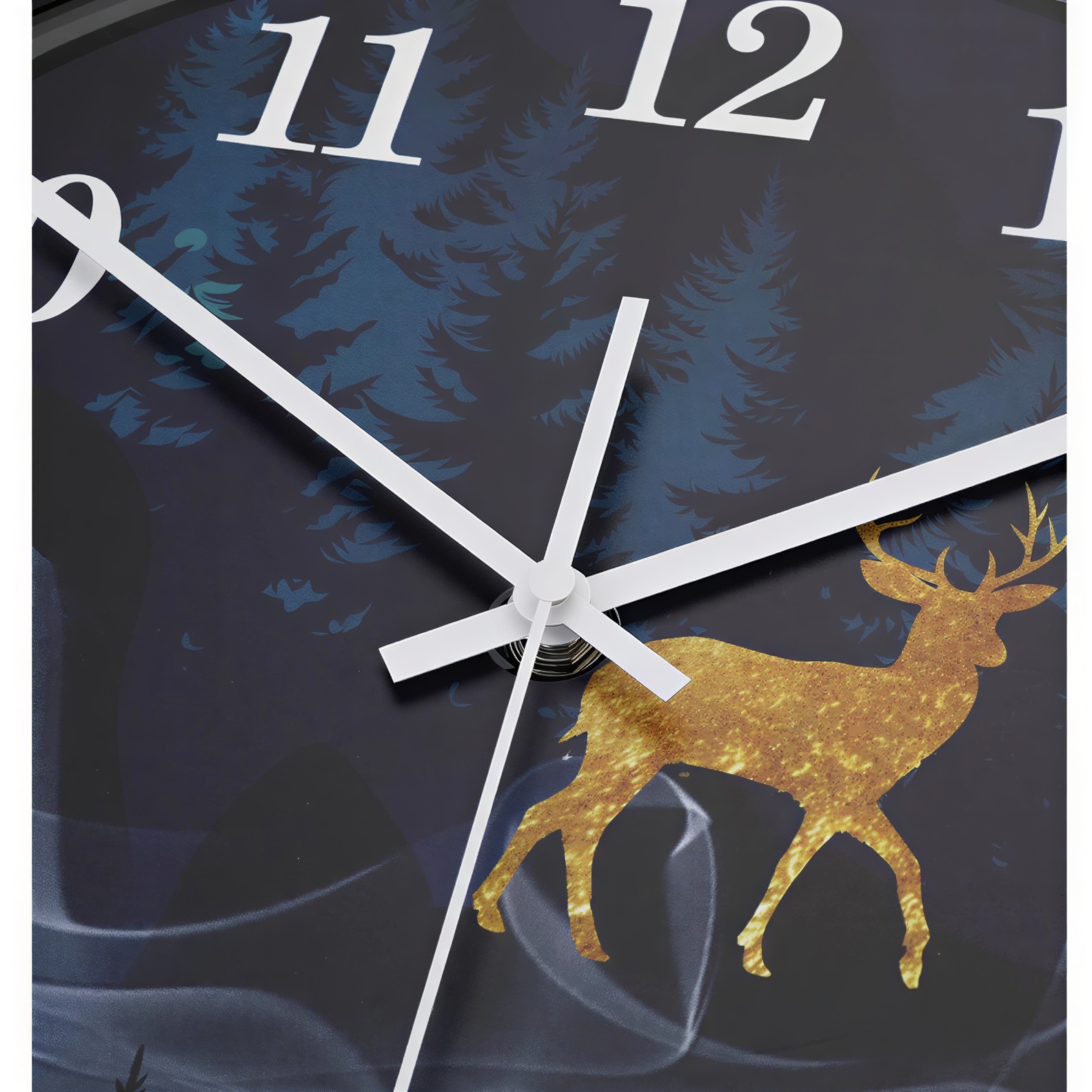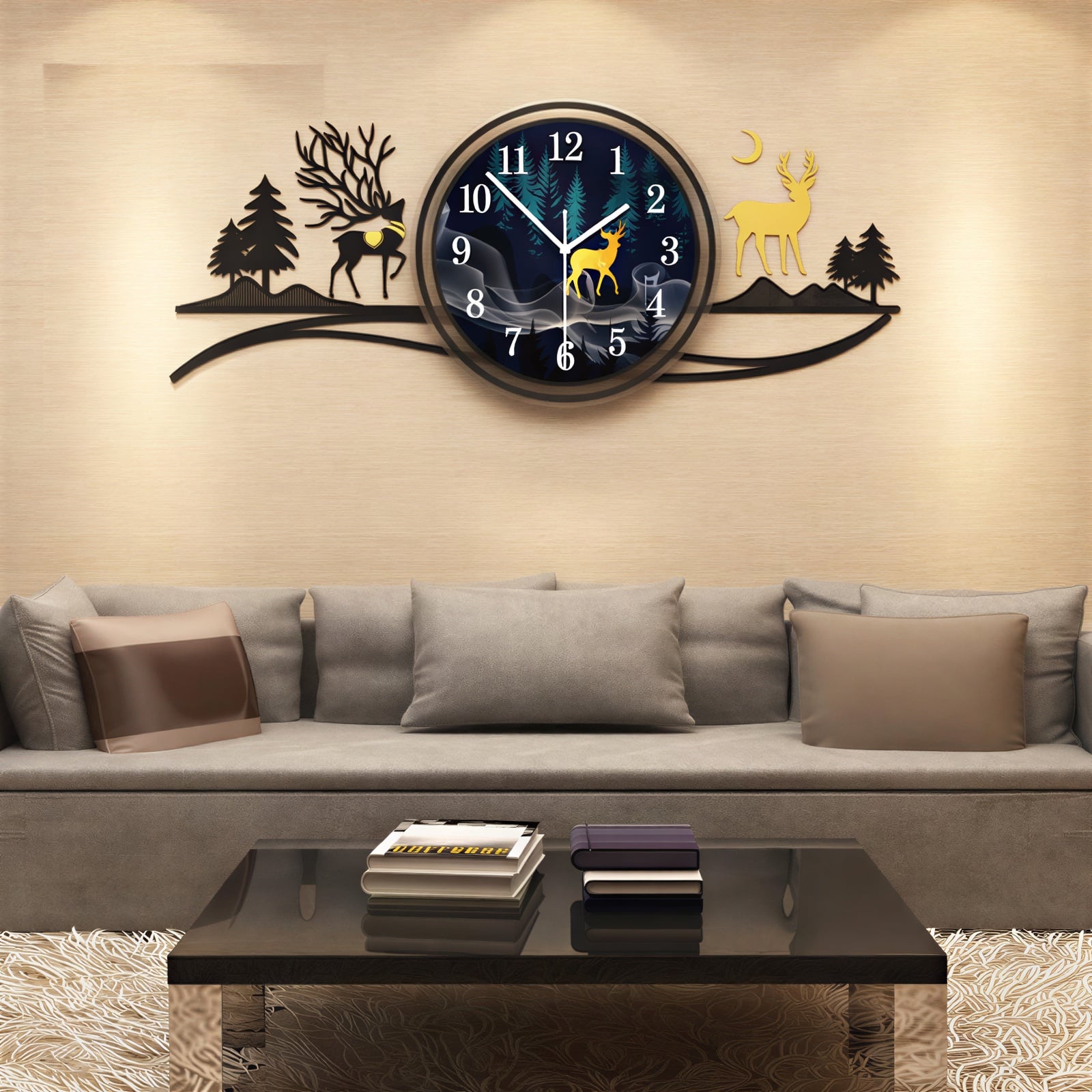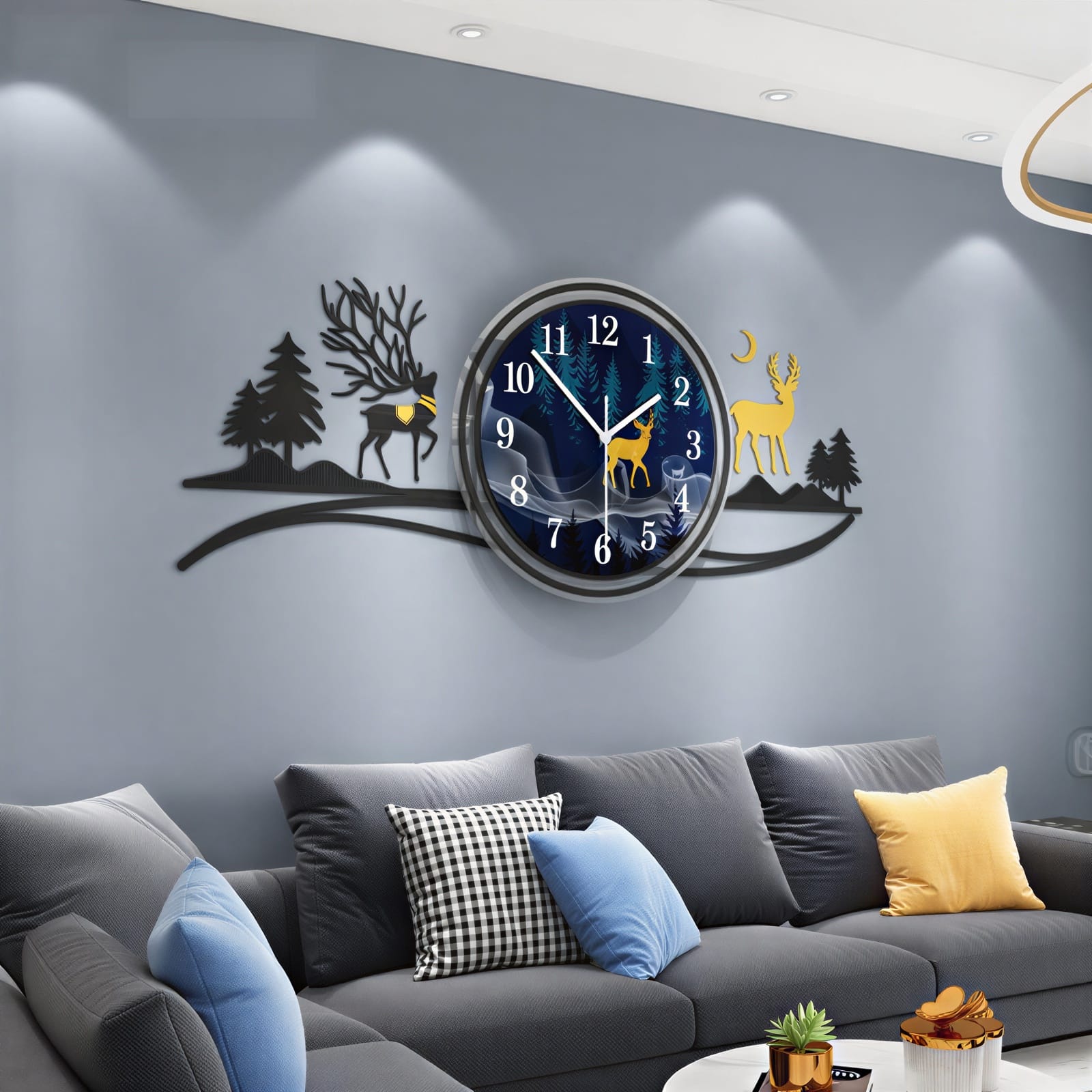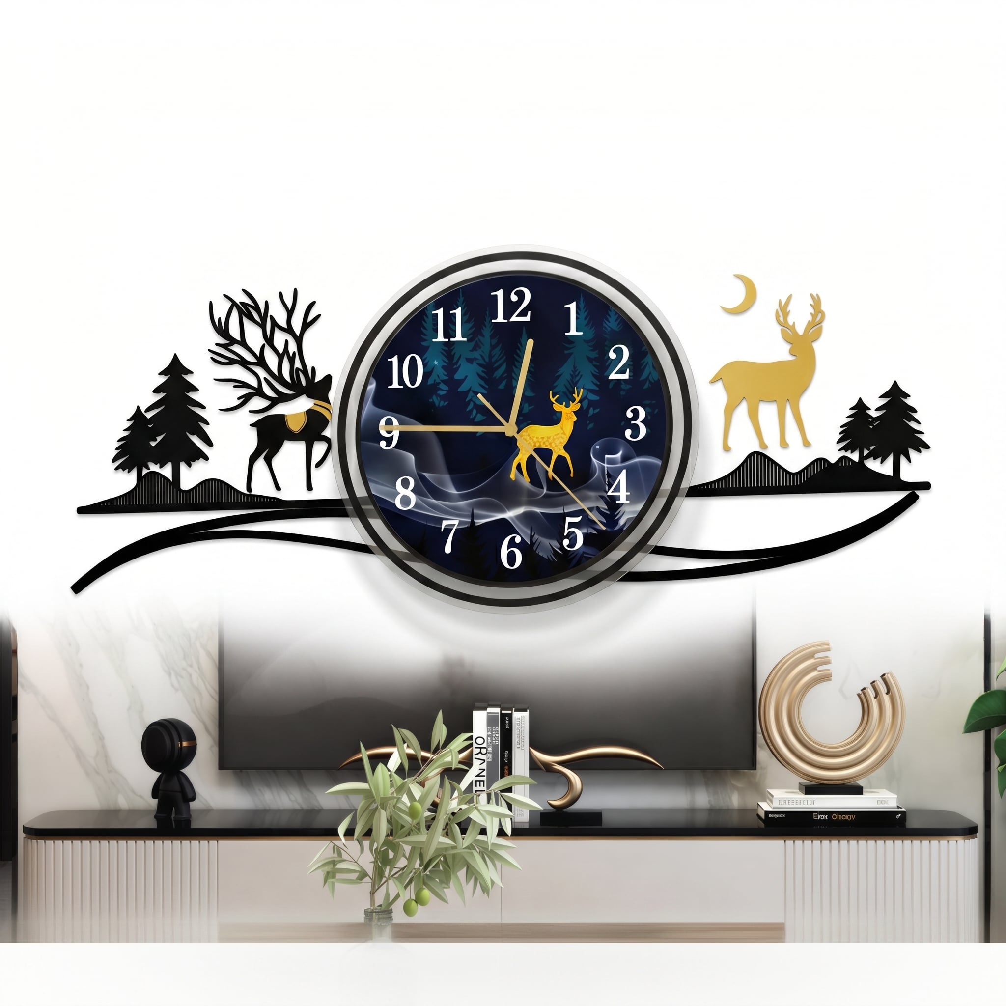 Avec l’Horloge murale design décorative cerfs, votre mur devient une scène calme et chic. En rentrant le soir, vous jetez un œil au cadran et la forêt bleu nuit apaise l’esprit, pendant que le cerf doré capte la lumière. Les grands chiffres se lisent vite, et l’ensemble donne du rythme à la pièce. Cette horloge murale crée une vraie déco nature dans le salon ou l’entrée. Lors d’un week-end à la campagne, elle prolonge l’ambiance des balades en forêt.