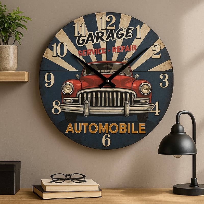 Faites entrer l’univers mécanique dans votre intérieur avec cette horloge murale bois inspirée des anciens garages américains. Son cadran vieilli, sa voiture rouge iconique et ses chiffres noirs patinés lui donnent un cachet vintage irrésistible. Elle s’invite parfaitement dans un bureau, un salon industriel ou une déco d’amateur de belles mécaniques.