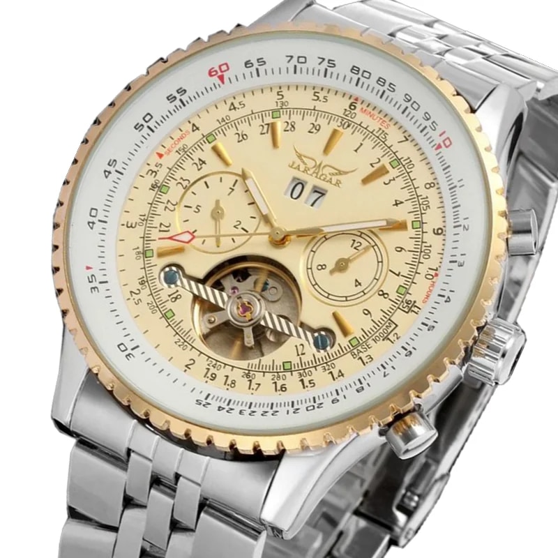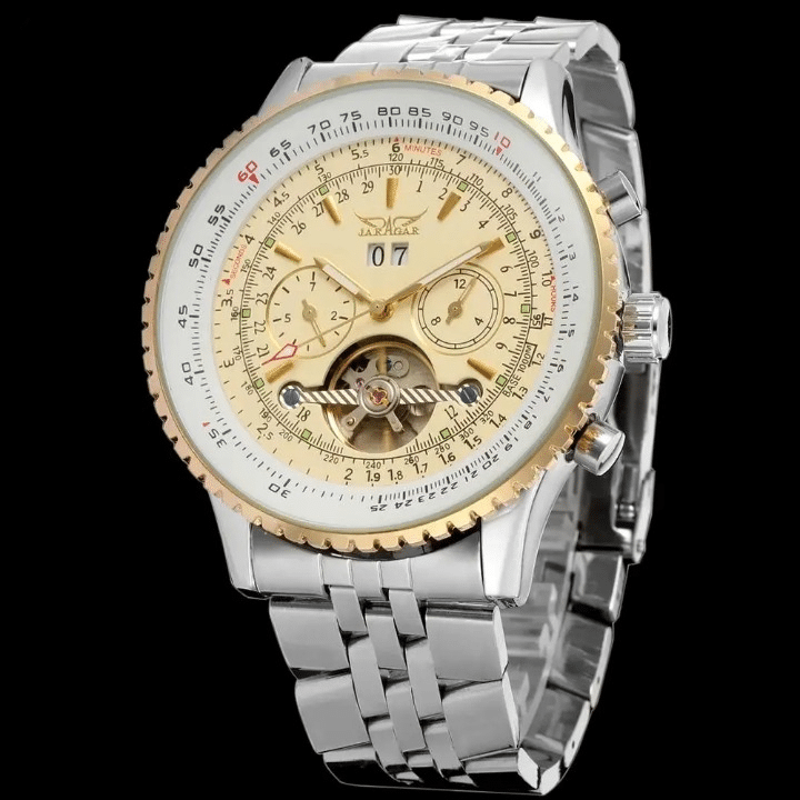 Le cadran doré de cette montre automatique femme, encadré par un boîtier argenté qui offre un contraste luxueux et attire le regard. C’est le choix parfait pour celles qui recherchent une montre élégante qui ajoute une touche de glamour à chaque tenue.