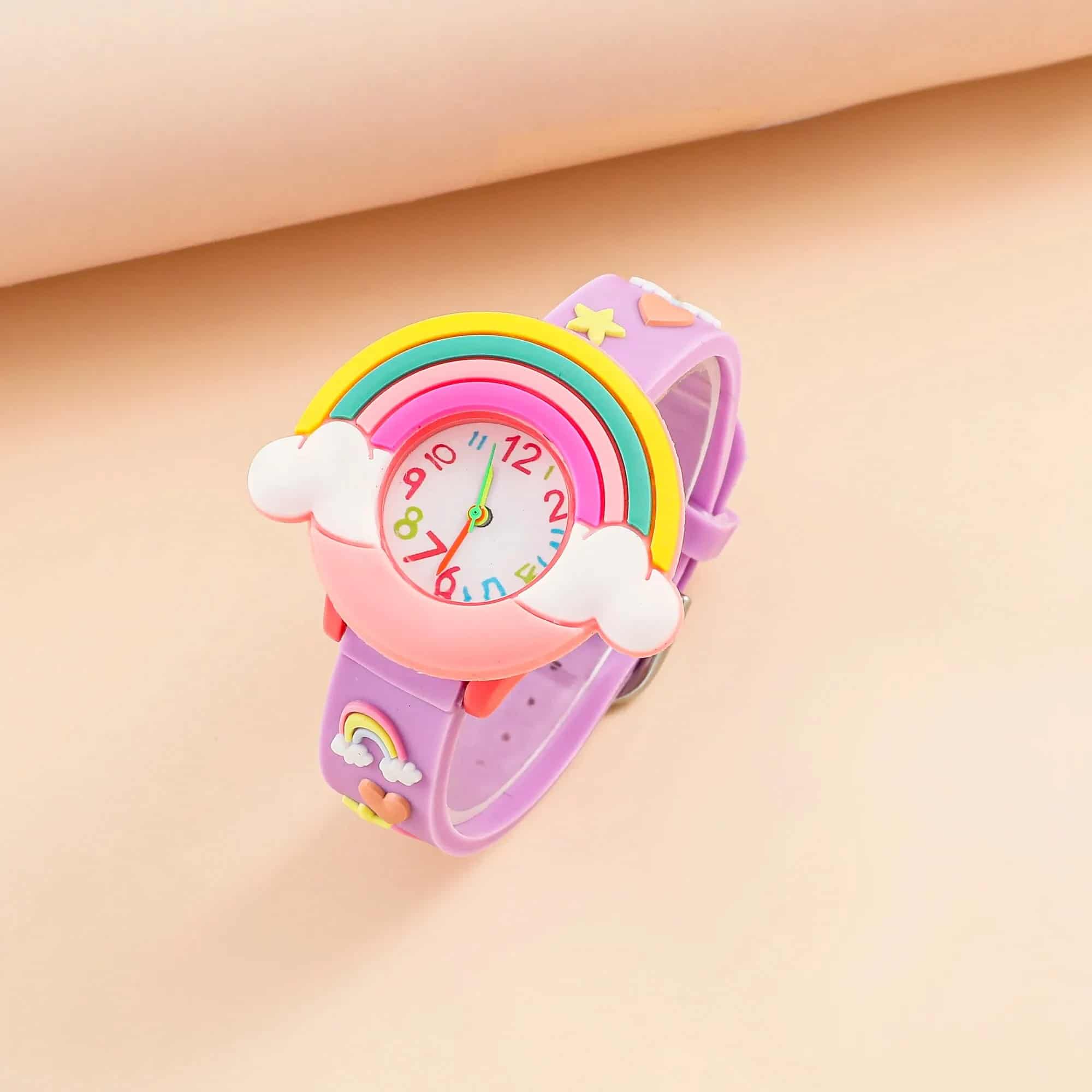 Cette montre arbore un cadran unique en forme d’arc-en-ciel, ajoutant une explosion de couleur qui plaira à toutes les petites fan de mode. Cette touche originale fait de cette montre plus qu’un simple outil pour apprendre à lire l’heure, c’est un véritable accessoire de mode qui stimule l’imagination et encourage l’expression personnelle à travers le style.