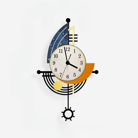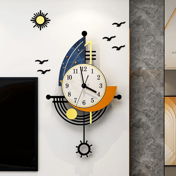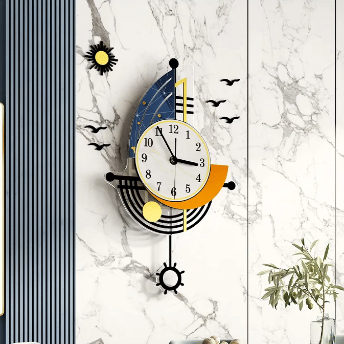 Naviguez vers une décoration intérieure audacieuse avec cette pendule murale grâce à ses couleurs bleues, orange et jaune, contrastées par des chiffres et des motifs noirs distinctifs. Chaque heure passée à bord de ce voilier apporte une vague de fraîcheur et d’originalité à votre espace.